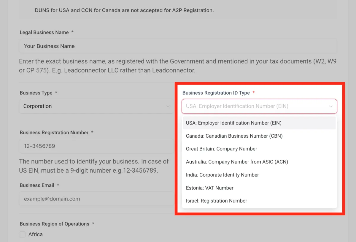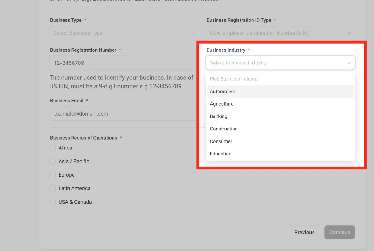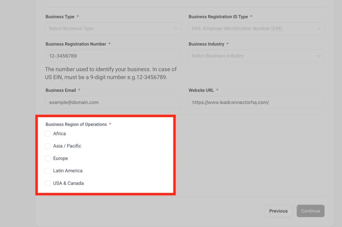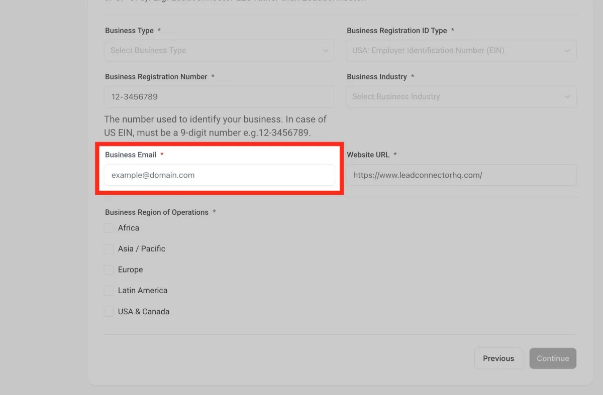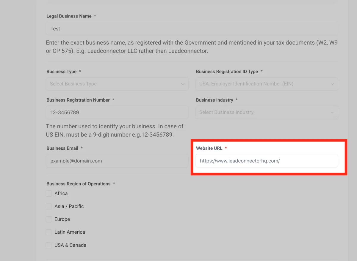 Ingresa tu número de registro comercial . En el caso de EE. UU., el EIN debe ser un número de 9 dígitos. Por ejemplo, 12-3456789.