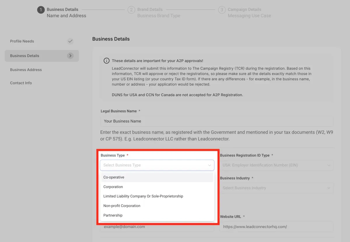 Utiliza el menú desplegable para seleccionar el tipo de negocio.