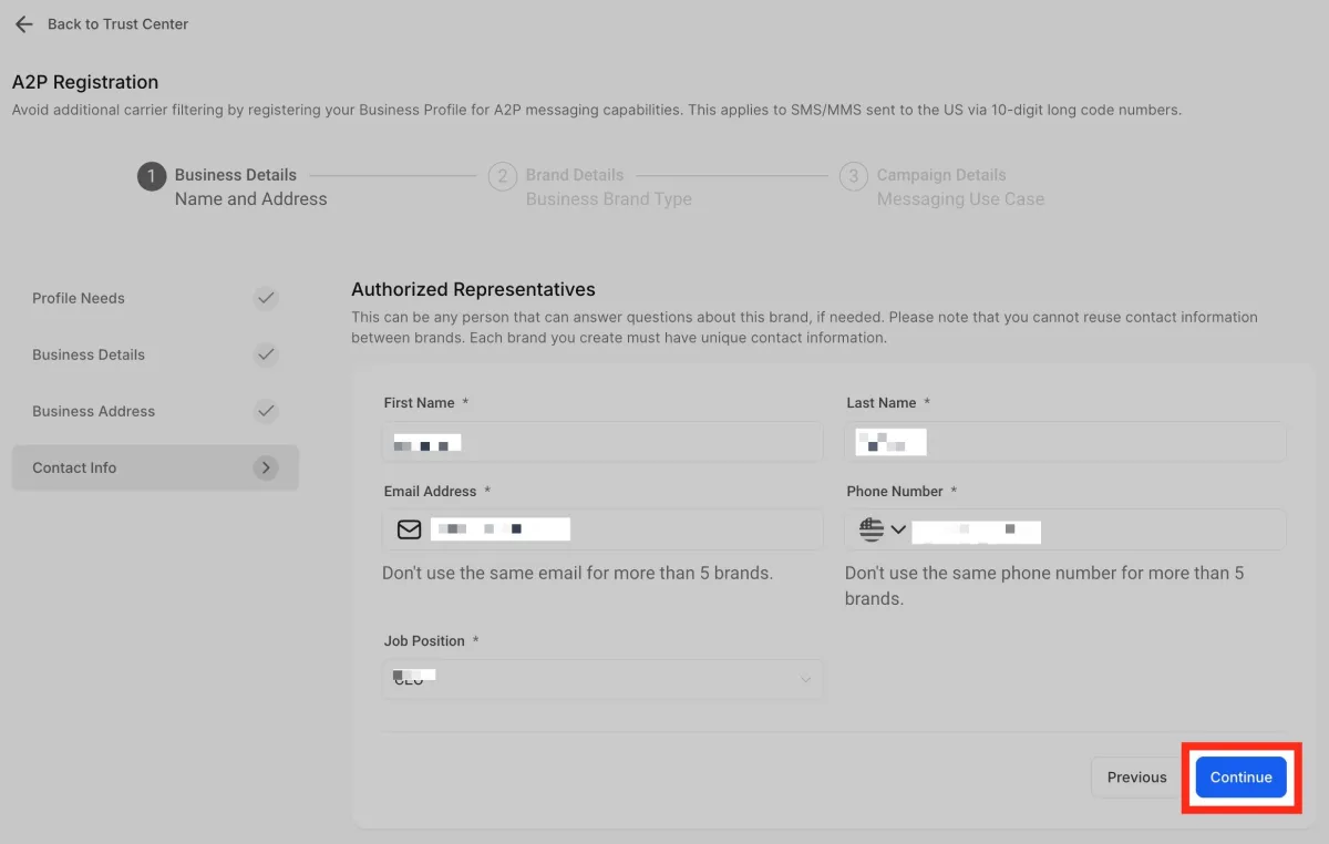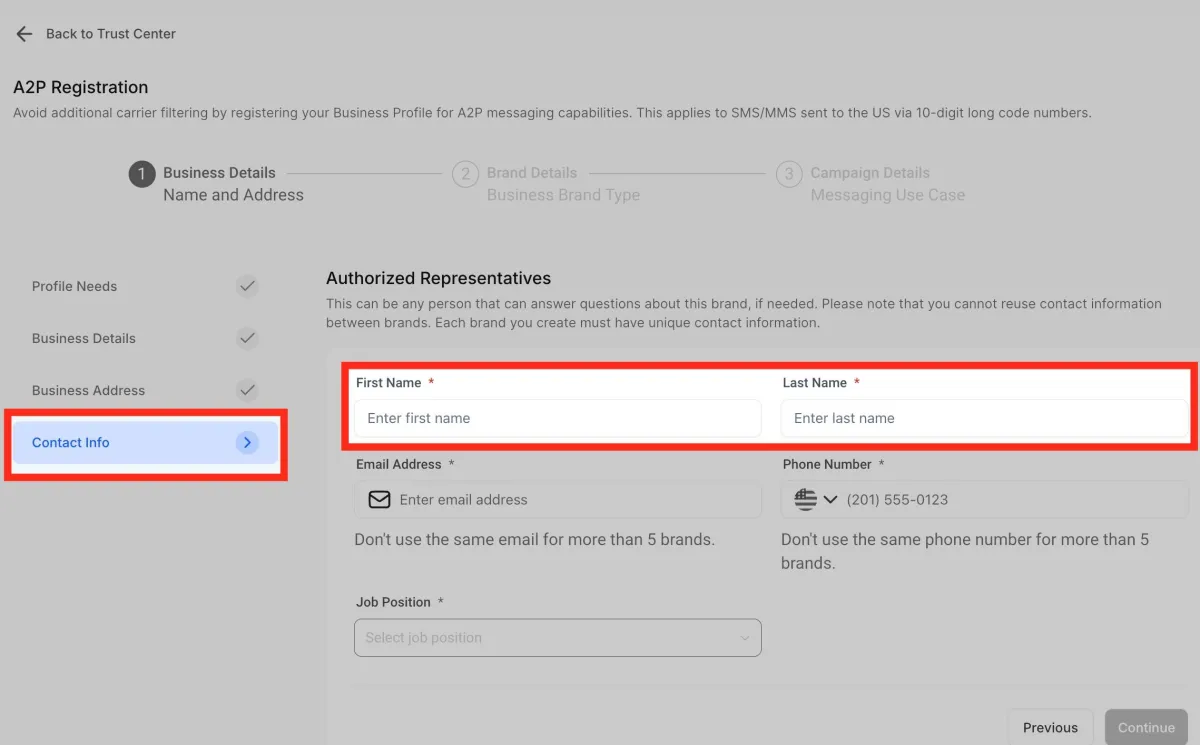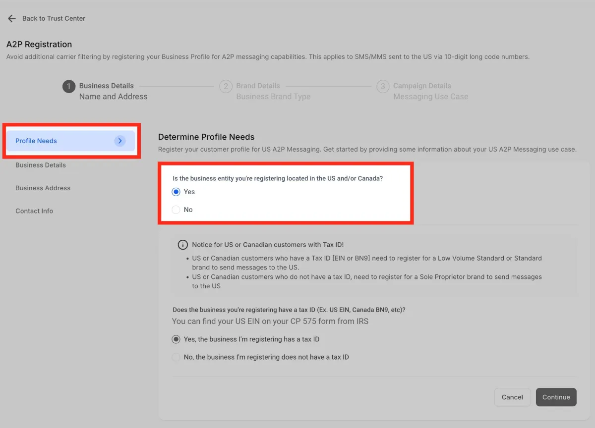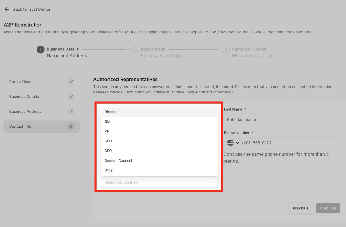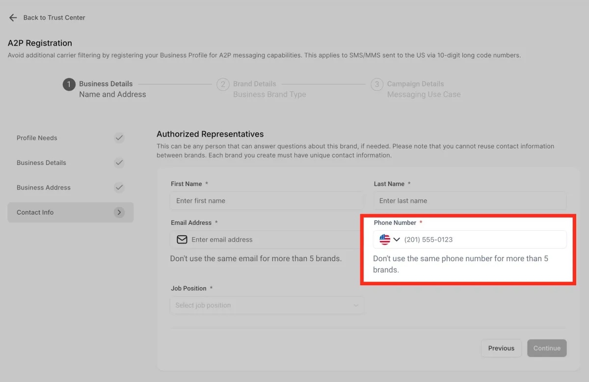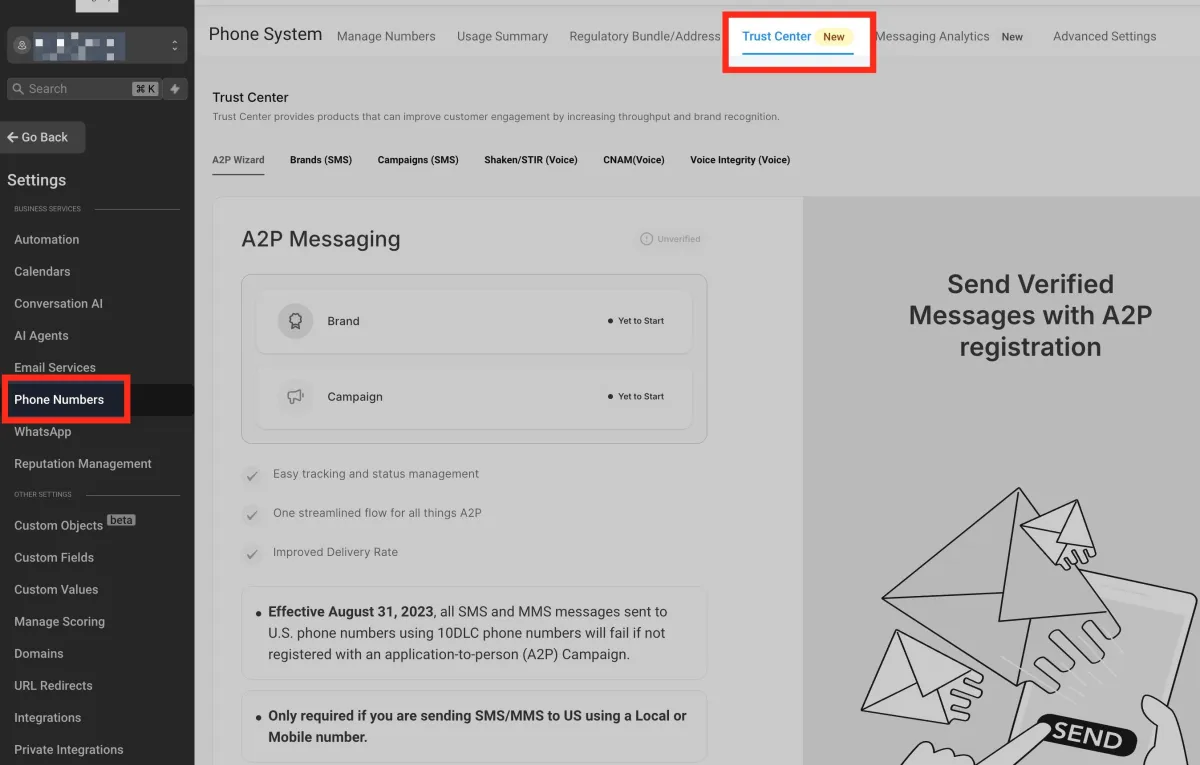 La opción “Trust Center” está dentro del menú de configuración, en la sección de números de teléfono.
